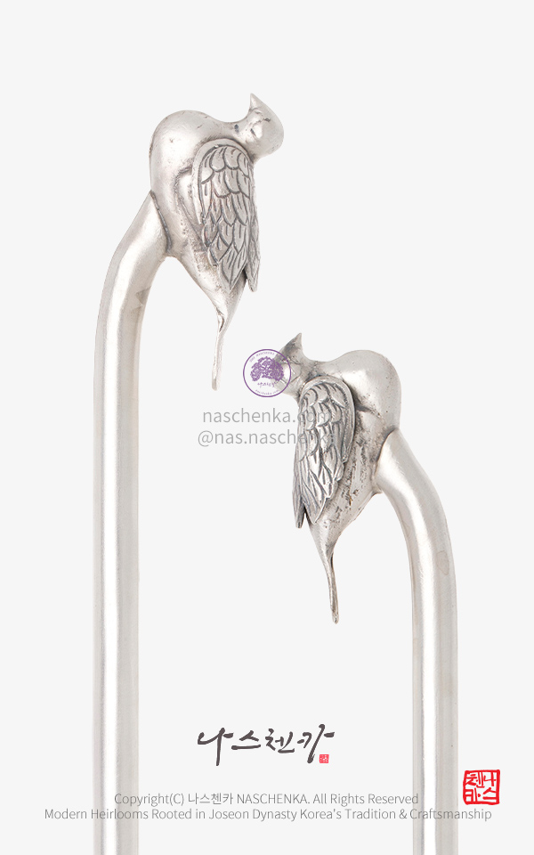 부부의 화합과 사랑의 상징인 원앙을 모티프로 한 순은비녀입니다.