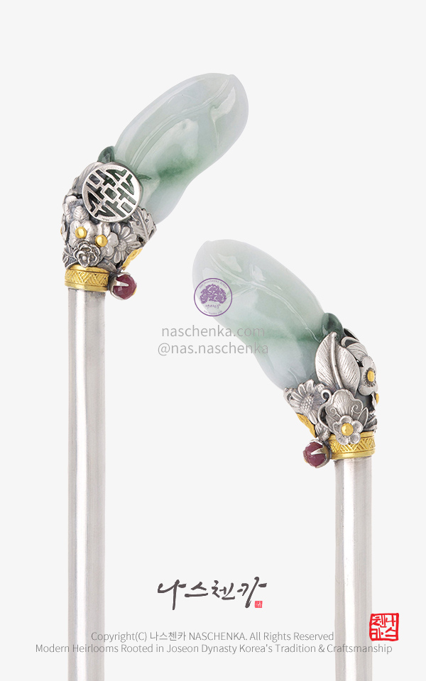 천연 비취 옥조각 + 루비포인트 꽃문양 하이엔드 은비녀 [Jade & Ruby Floral Silver Hairpin]