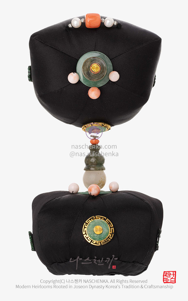 천연 비취로 무게 중심을 안정감 있게 잡은 고급 전통 족두리입니다.